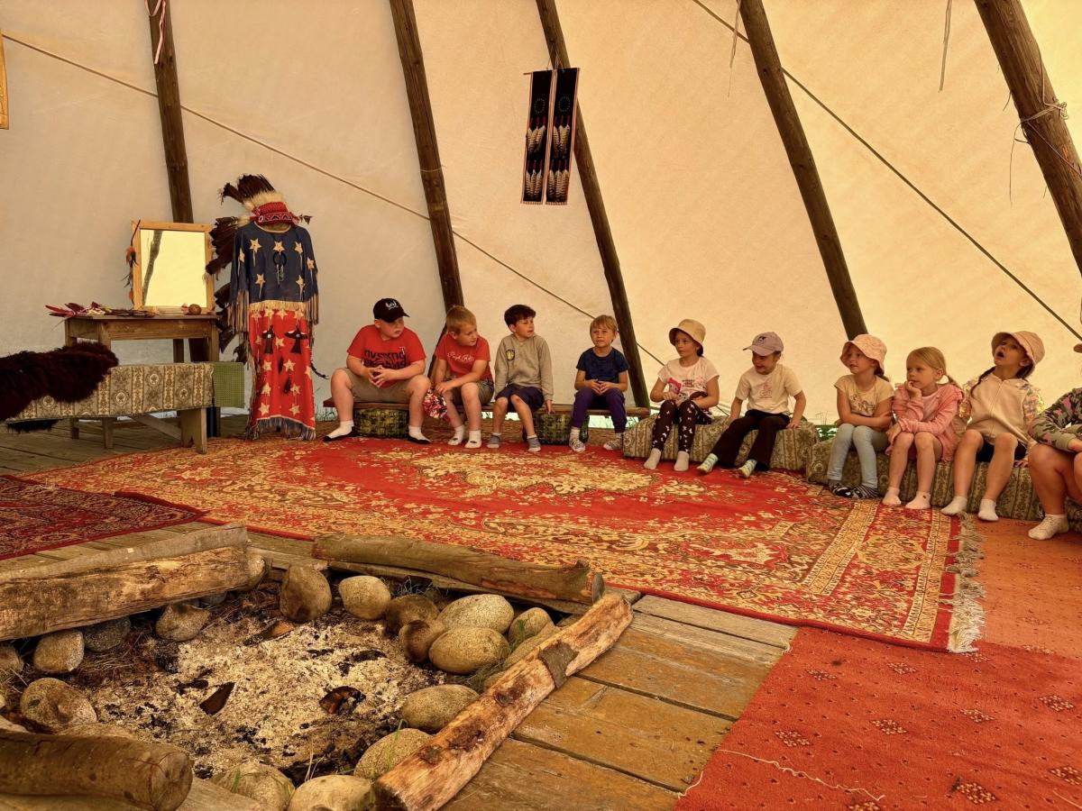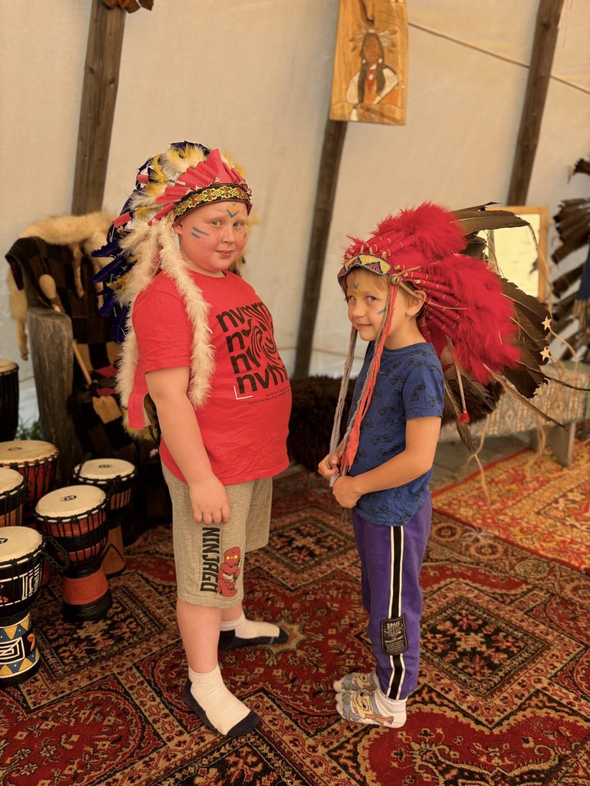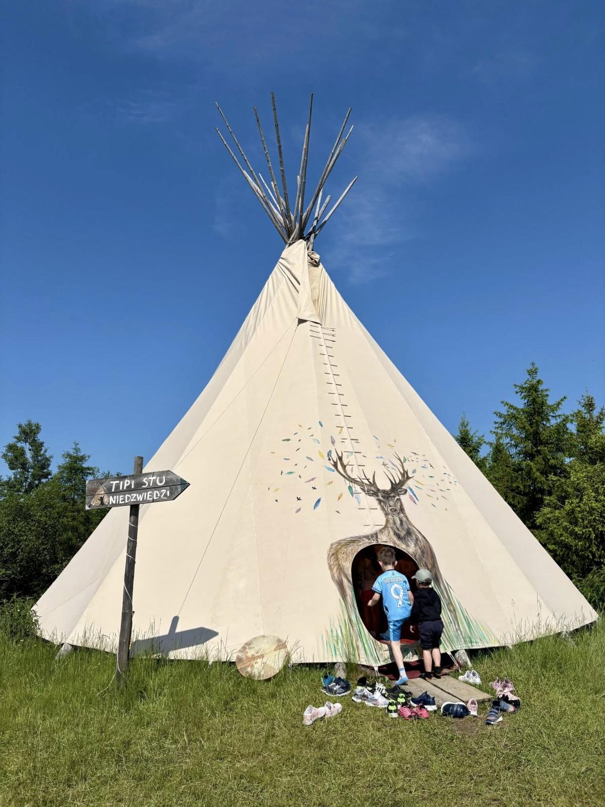 W indiańskich pióropuszach i z własnoręcznie wykonanymi bransoletkami dzieci przeniosły się w magiczny świat zabawy i przygody. Podczas pobytu mogły także przebywać w prawdziwych namiotach indiańskich tipi, co sprawiło im ogromną frajdę i pozwoliło jeszcze lepiej poczuć klimat wioski!