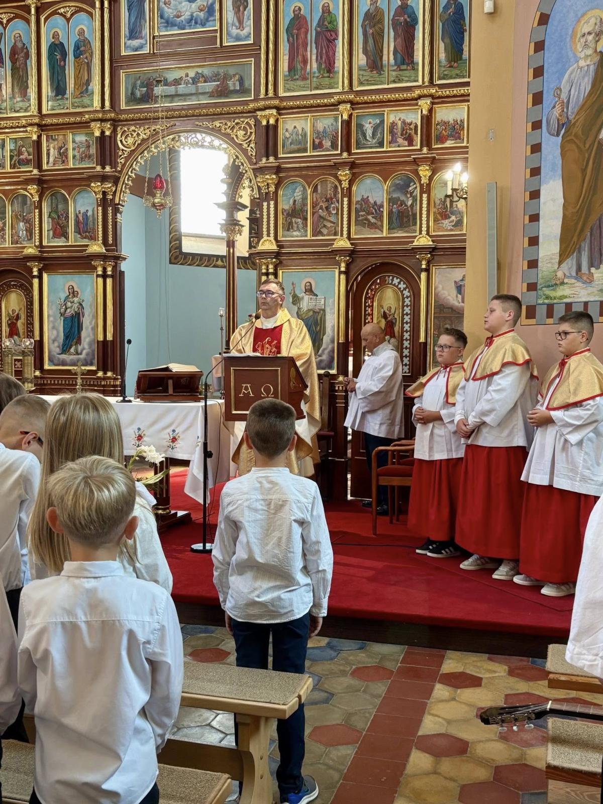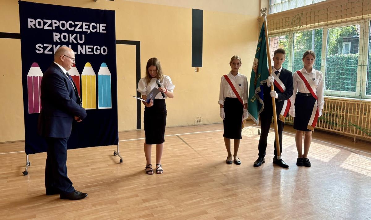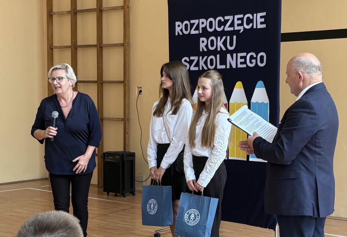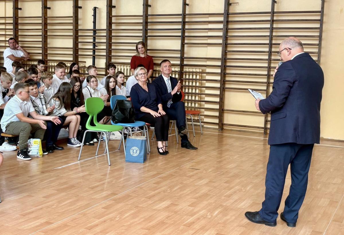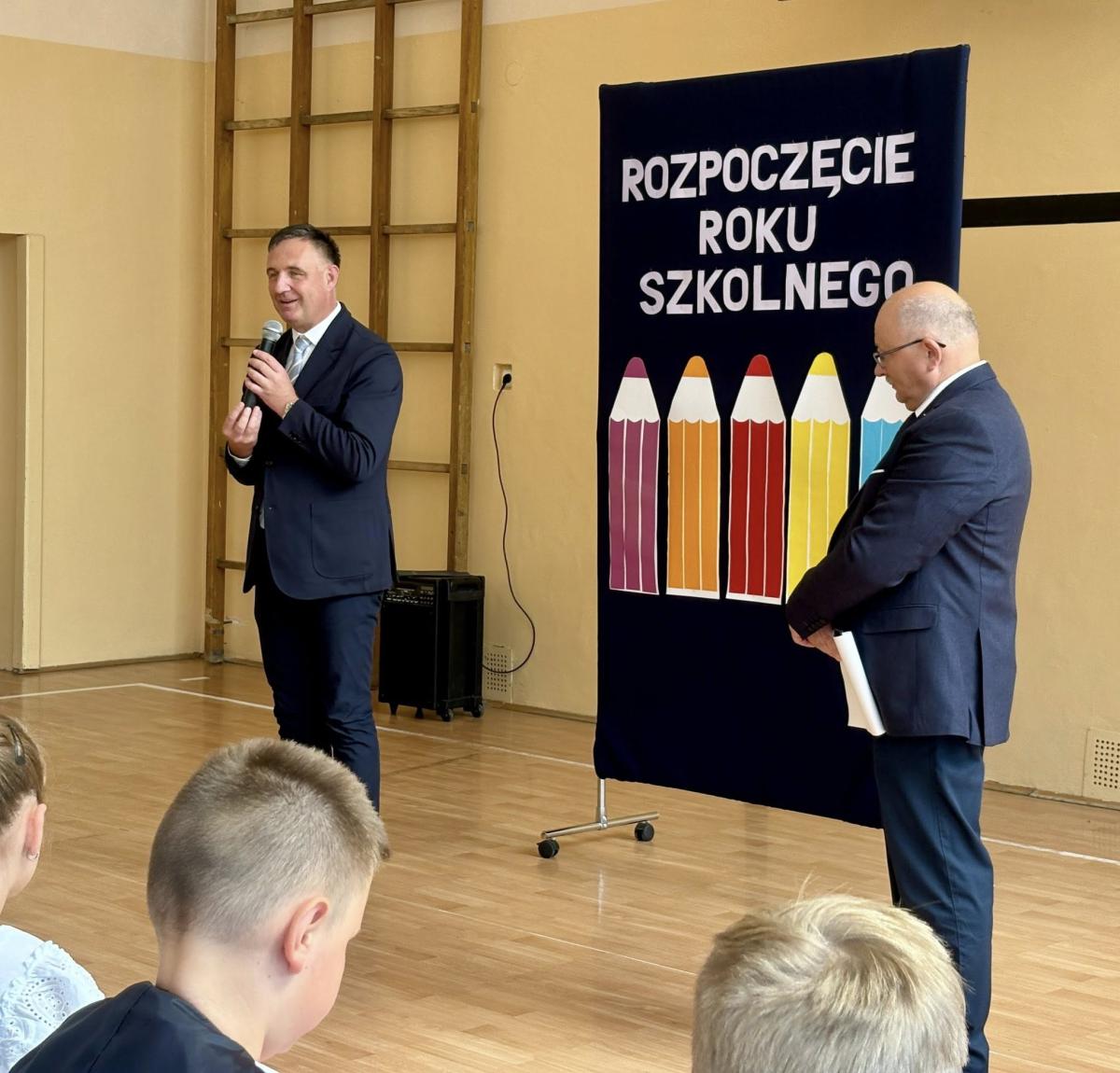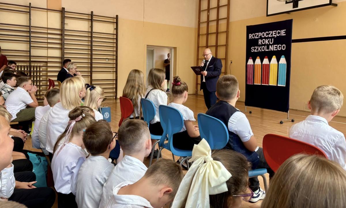 Pan Dyrektor z radością powitał uczniów, rodziców, nauczycieli oraz zaproszonych gości. Podkreślił, że nowy rok szkolny to zawsze wyjątkowy moment – pełen nadziei, wyzwań i planów.