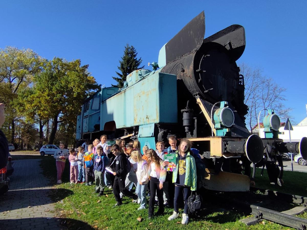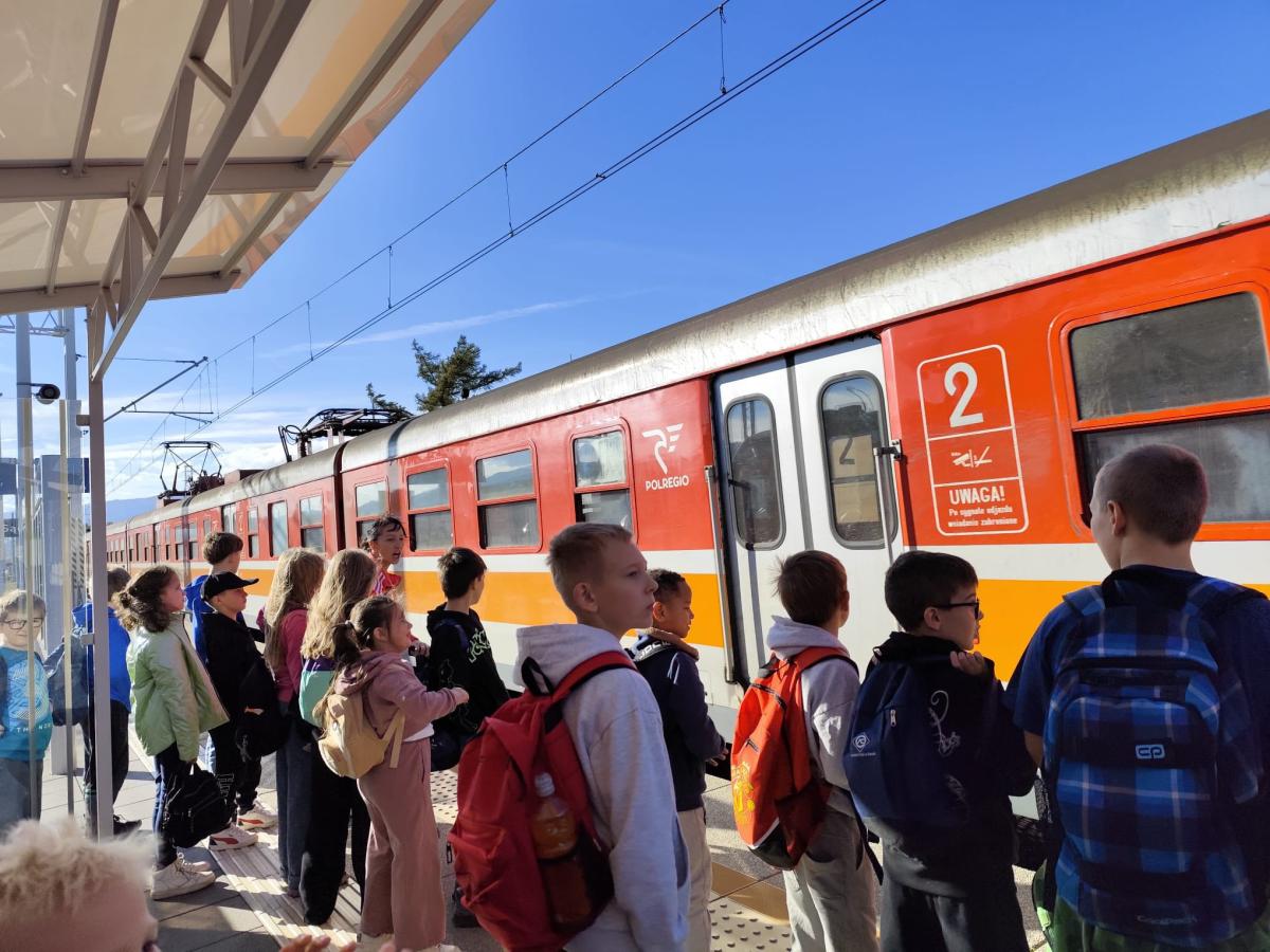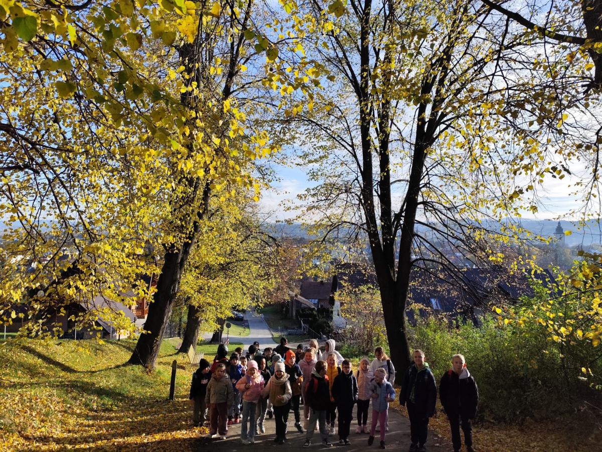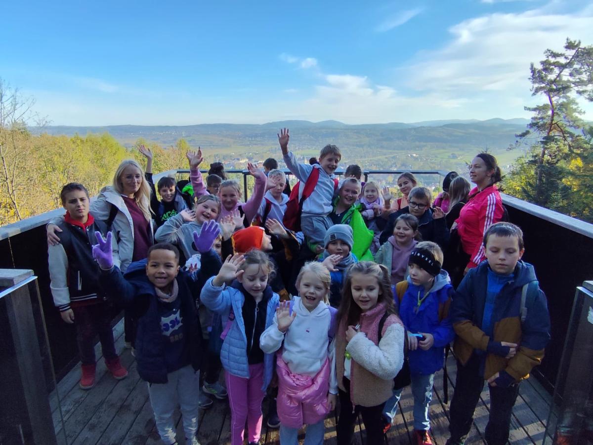 W słoneczny poranek 23 października 2025 r. uczniowie z klasy I i IV wybrali się na wycieczkę ,,Śladami psa Lampo". Pierwszym punktem naszej wyprawy był spacer na Leśne Molo w Starym Sączu. Idąc leśną drogą oglądaliśmy szklane kopuły przypominające krople rosy w których przedstawiono kolejne etapy rozwoju żaby. Od jajka, przez kijankę, aż po dorosłego płaza. Była to ciekawa, edukacyjna lekcja przyrody ukryta w lesie. Po dotarciu na platformę widokową podziwialiśmy widok na panoramę Starego Sącza z wieżami kościołów i dachami kamienic wyłaniającymi wśród jesiennych kolorów drzew. Zeszliśmy spiralnymi schodami i wracając przez las cieszyliśmy oczy widokiem pięknej, złotej jesieni. Kolejnym punktem naszej wycieczki była podróż pociągiem do Nowego Sącza. Tam czekał na nas pan Kazimierz który oprowadził nas po stacji PKP i ciekawie opowiadał o tym jak powstawały kolejne sceny do filmu „O psie który jeździł koleją”. Spacerując po dworcu kolejowym nasza wyobraźnia podpowiadała nam różne obrazy dlatego udaliśmy się do kina, aby czym prędzej obejrzeć cały film. Atmosfera była pełna emocji - jedni z zaciekawieniem śledzili akcje filmu, inni szukali znajomych miejsc. Na ostudzenie emocji wybraliśmy spacer alejkami jesiennego parku i w doskonałych humorach wróciliśmy do domu.