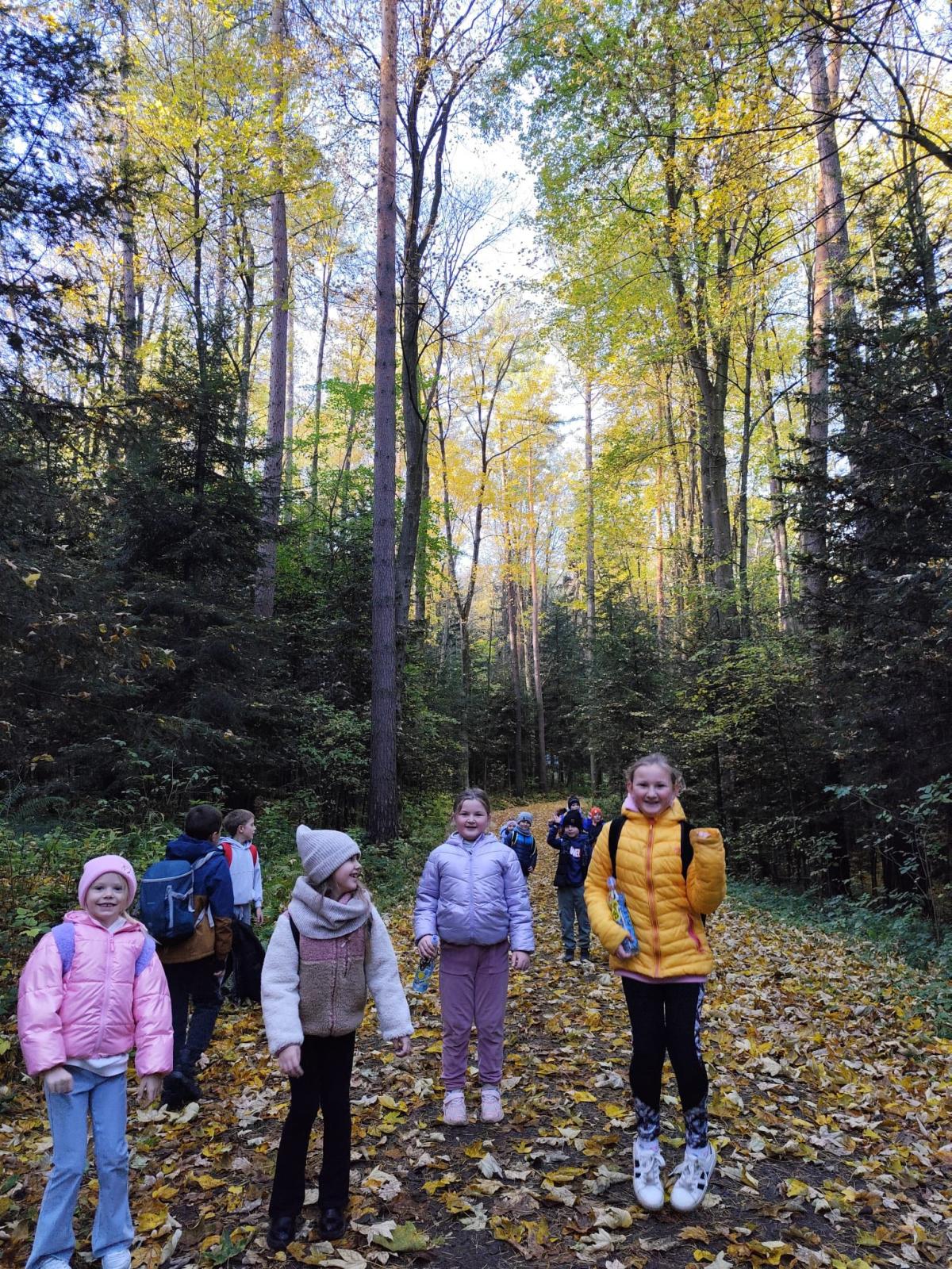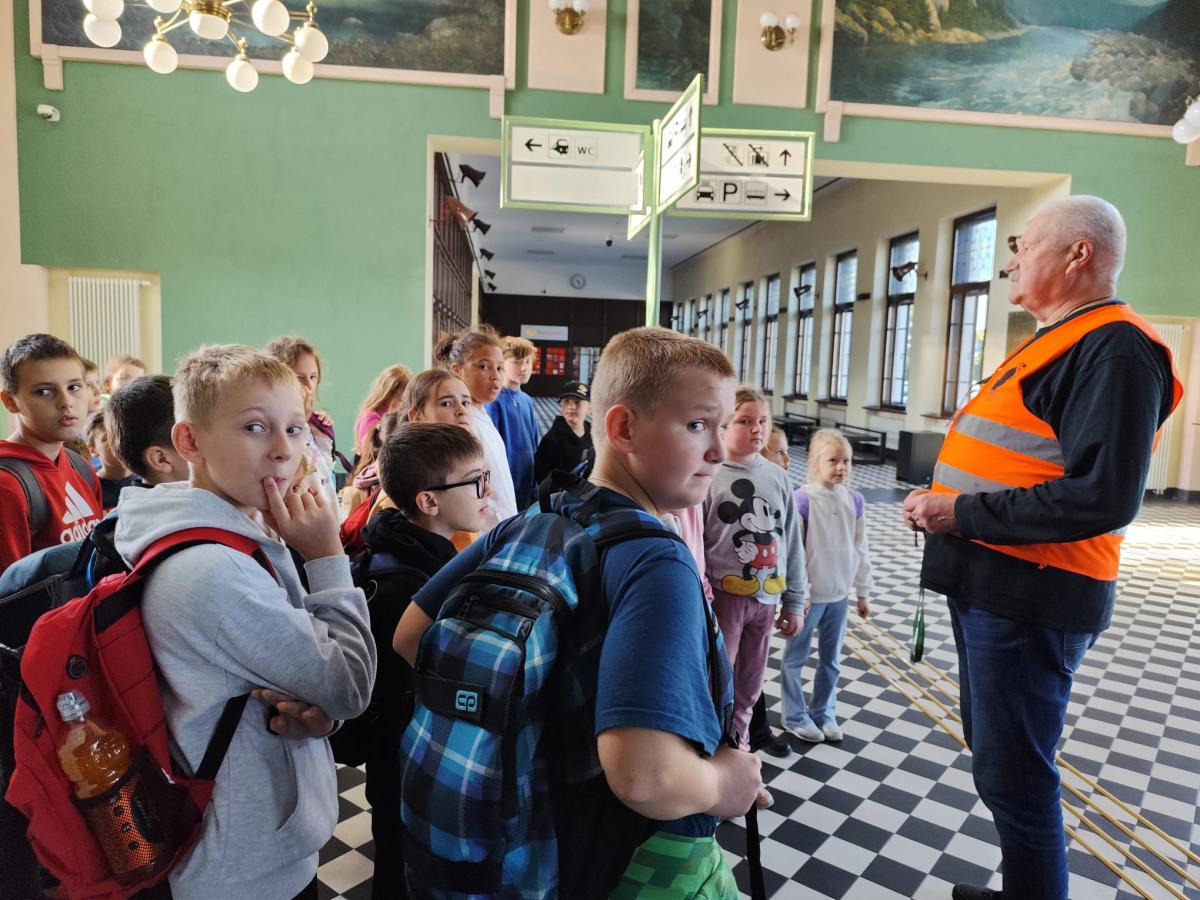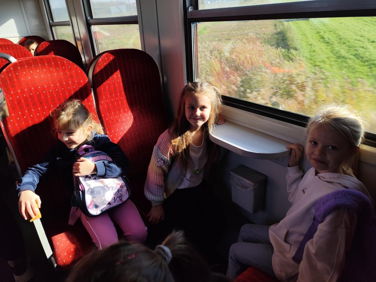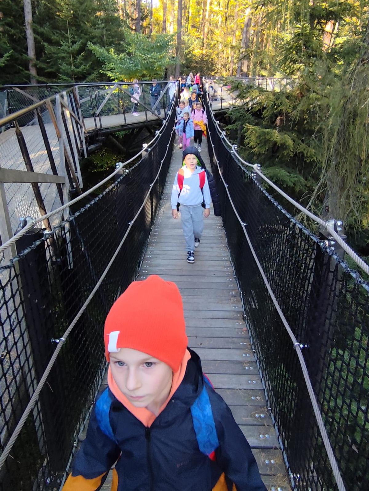 W słoneczny poranek 23 października 2025 r. uczniowie z klasy I i IV wybrali się na wycieczkę ,,Śladami psa Lampo". Pierwszym punktem naszej wyprawy był spacer na Leśne Molo w Starym Sączu. Idąc leśną drogą oglądaliśmy szklane kopuły przypominające krople rosy w których przedstawiono kolejne etapy rozwoju żaby. Od jajka, przez kijankę, aż po dorosłego płaza. Była to ciekawa, edukacyjna lekcja przyrody ukryta w lesie. Po dotarciu na platformę widokową podziwialiśmy widok na panoramę Starego Sącza z wieżami kościołów i dachami kamienic wyłaniającymi wśród jesiennych kolorów drzew. Zeszliśmy spiralnymi schodami i wracając przez las cieszyliśmy oczy widokiem pięknej, złotej jesieni. Kolejnym punktem naszej wycieczki była podróż pociągiem do Nowego Sącza. Tam czekał na nas pan Kazimierz który oprowadził nas po stacji PKP i ciekawie opowiadał o tym jak powstawały kolejne sceny do filmu „O psie który jeździł koleją”. Spacerując po dworcu kolejowym nasza wyobraźnia podpowiadała nam różne obrazy dlatego udaliśmy się do kina, aby czym prędzej obejrzeć cały film. Atmosfera była pełna emocji - jedni z zaciekawieniem śledzili akcje filmu, inni szukali znajomych miejsc. Na ostudzenie emocji wybraliśmy spacer alejkami jesiennego parku i w doskonałych humorach wróciliśmy do domu.