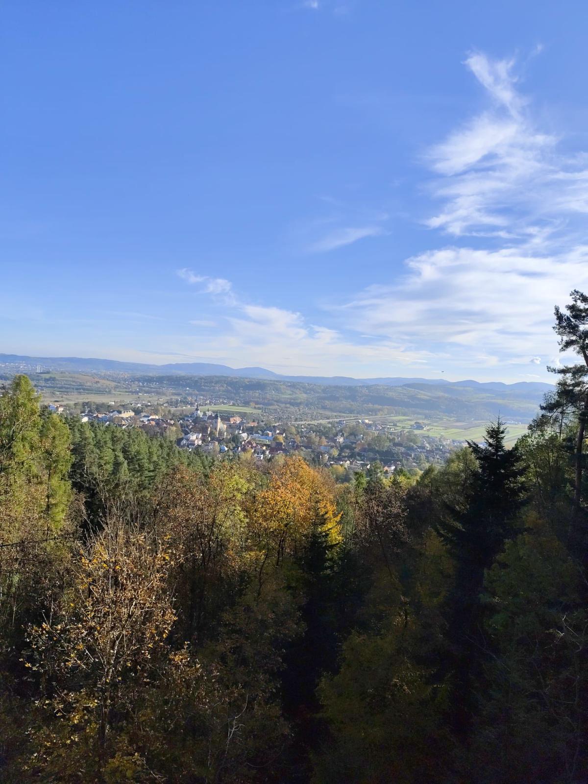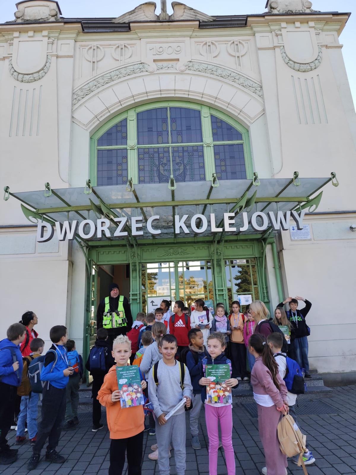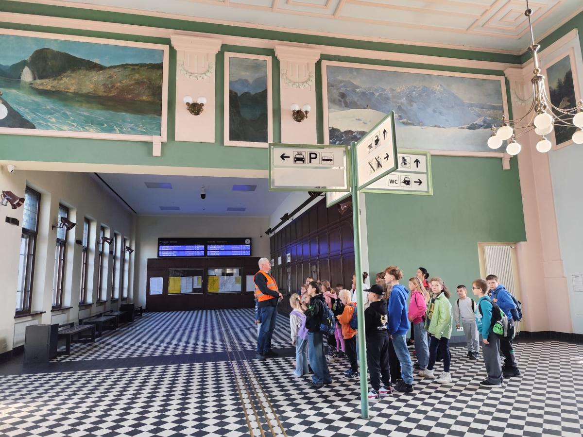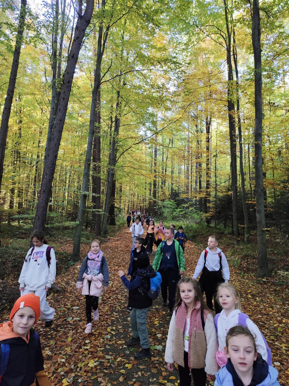 W słoneczny poranek 23 października 2025 r. uczniowie z klasy I i IV wybrali się na wycieczkę ,,Śladami psa Lampo". Pierwszym punktem naszej wyprawy był spacer na Leśne Molo w Starym Sączu. Idąc leśną drogą oglądaliśmy szklane kopuły przypominające krople rosy w których przedstawiono kolejne etapy rozwoju żaby. Od jajka, przez kijankę, aż po dorosłego płaza. Była to ciekawa, edukacyjna lekcja przyrody ukryta w lesie. Po dotarciu na platformę widokową podziwialiśmy widok na panoramę Starego Sącza z wieżami kościołów i dachami kamienic wyłaniającymi wśród jesiennych kolorów drzew. Zeszliśmy spiralnymi schodami i wracając przez las cieszyliśmy oczy widokiem pięknej, złotej jesieni. Kolejnym punktem naszej wycieczki była podróż pociągiem do Nowego Sącza. Tam czekał na nas pan Kazimierz który oprowadził nas po stacji PKP i ciekawie opowiadał o tym jak powstawały kolejne sceny do filmu „O psie który jeździł koleją”. Spacerując po dworcu kolejowym nasza wyobraźnia podpowiadała nam różne obrazy dlatego udaliśmy się do kina, aby czym prędzej obejrzeć cały film. Atmosfera była pełna emocji - jedni z zaciekawieniem śledzili akcje filmu, inni szukali znajomych miejsc. Na ostudzenie emocji wybraliśmy spacer alejkami jesiennego parku i w doskonałych humorach wróciliśmy do domu.