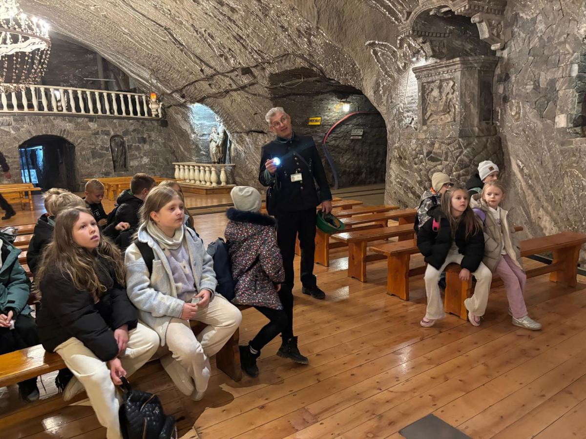 Przed wejściem czekał na nich pan przewodnik, który poprowadził grupę trasą turystyczną. Dzięki multimedialnym prezentacjom przenieśli się w czasie i mogli zobaczyć, jak na przestrzeni wieków wyglądała ciężka i wymagająca praca górników. Klasa dowiedziedziała się, że w kopalni wykorzystywano kiedyś proste narzędzia, siłę ludzkich mięśni i konie, a sól stanowiła jedno z najcenniejszych bogactw Królestwa Polskiego. Przeprawiali się również łodzią przez zalaną komorę, co było wyjątkową atrakcją i dostarczyło niesamowitych wrażeń.