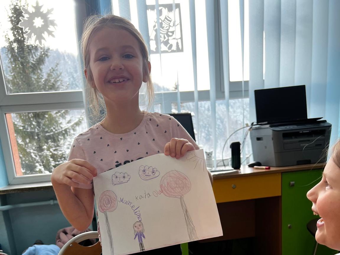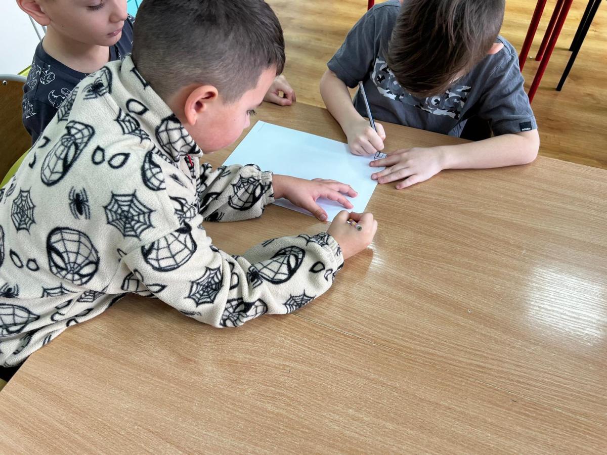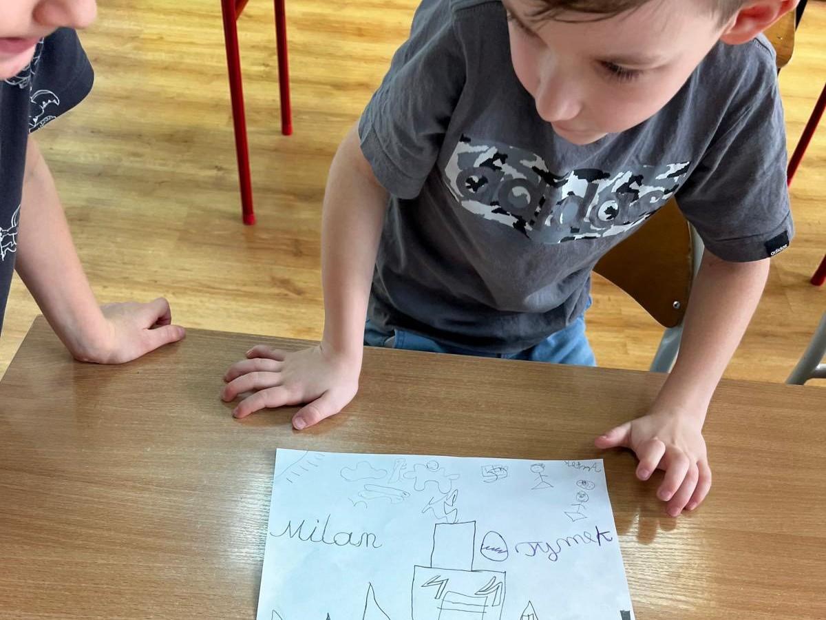 Następnie, uczniowie pracowali w grupach, wykonując wspólny obrazek. Zadanie polegało na dorysowywaniu po jednym elemencie przez każdego członka zespołu. Ćwiczenie, miało na celu rozwijanie umiejętności współpracy, organizacji pracy, czekania na swoją kolej oraz podejmowania wspólnych decyzji. Każda grupa prezentowała swoją pracę. Uczniowie, opowiadali o wykonanym obrazku oraz o tym, jak przebiegała współpraca w zespole. Grupy wspólnie podejmowały decyzję o wyborze jednej osoby, która reprezentowała zespół i przedstawiała efekty pracy.