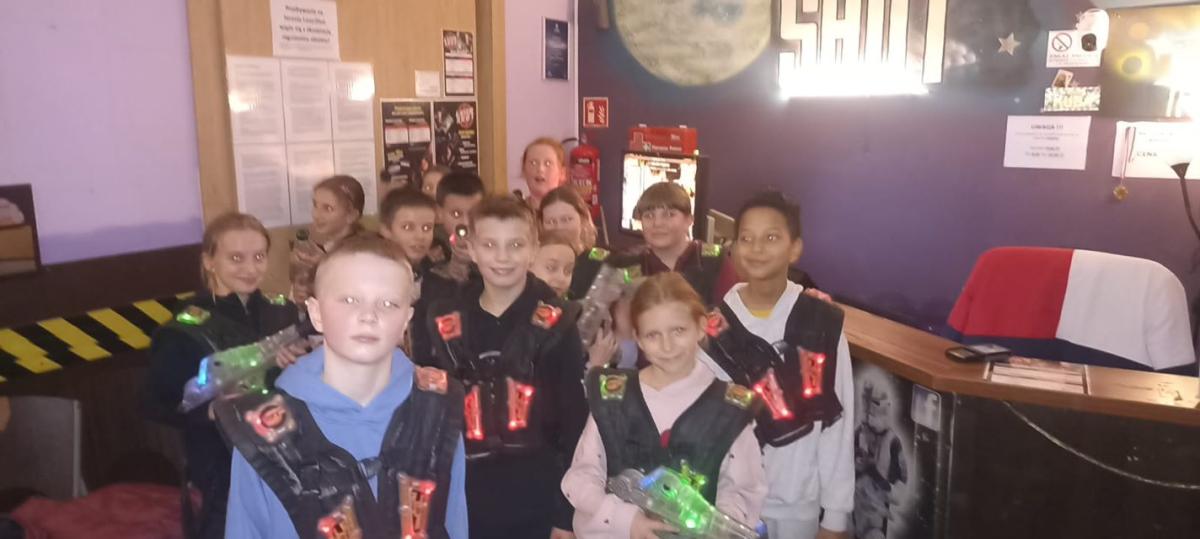 Po historycznej części wycieczki przyszedł czas na zabawę – klasa odwiedziła pobliski plac zabaw, gdzie każdy mógł rozładować energię i wspólnie spędzić czas na świeżym powietrzu. Kolejną atrakcją była zabawa w parku rozrywki LaserShot, które okazało się prawdziwym hitem. Uczniowie świetnie bawili się podczas rywalizacji pełnej śmiechu, ruchu i dobrej zabawy.
