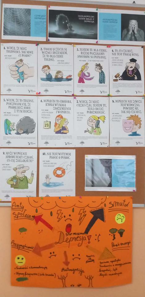 Uczniowie zostali także zapoznani z numerami telefonów zaufania oraz innymi formami pomocy, z których mogą skorzystać w trudnych sytuacjach. Dodatkowo wykonana została gazetka szkolna poświęcona tematyce depresji.